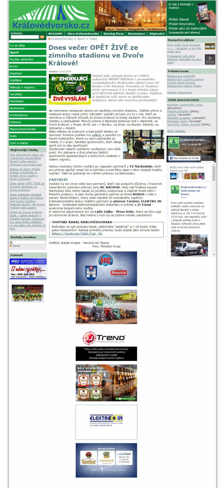 Mediální výstupy živých vysílání zápasů HC Rodos a HC Náchod