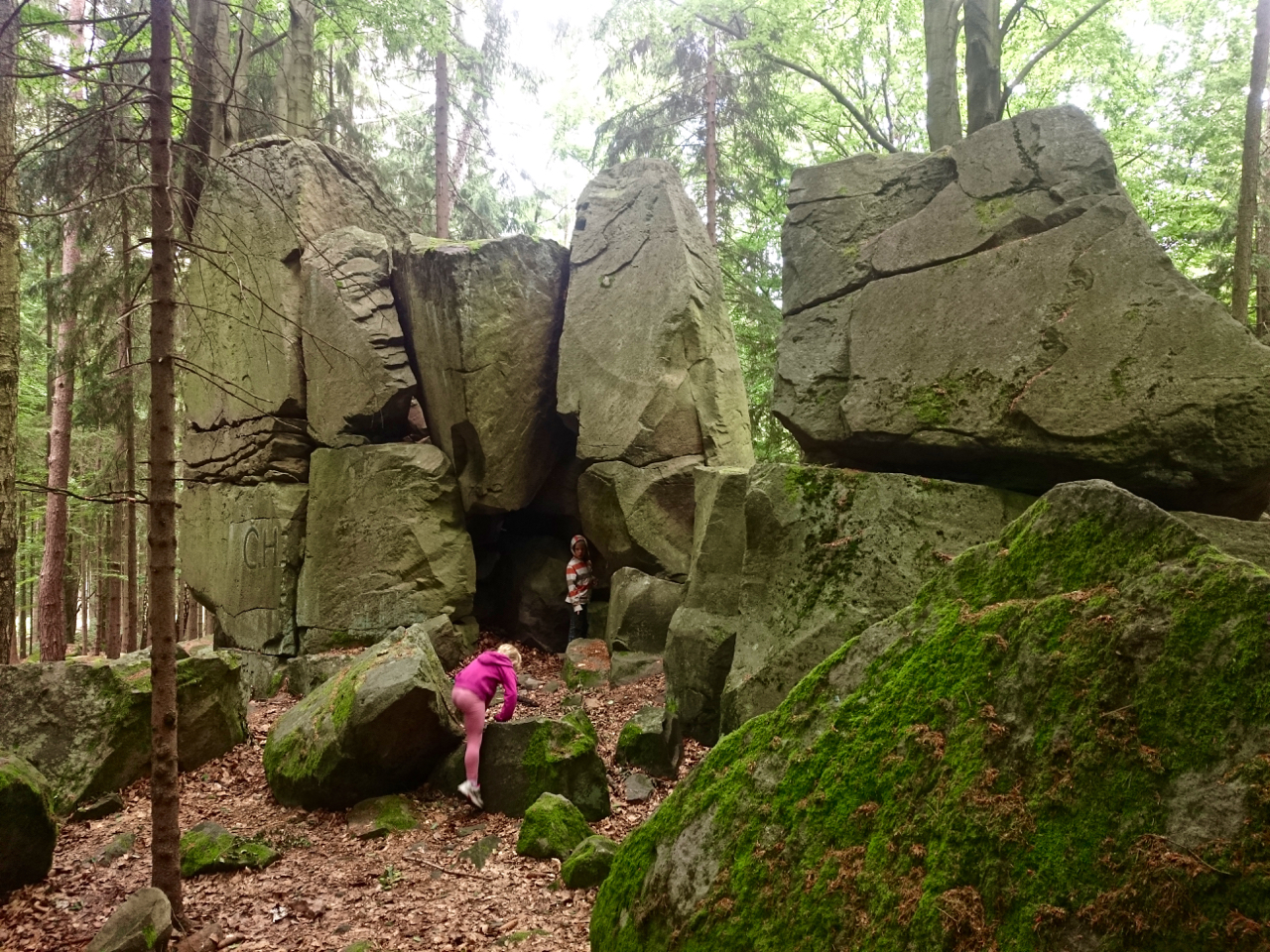 Zvětralé pískovce nedaleko Dvora Králové nad Labem v podobě skalních útvarů nebo jen pohozených balvanů jsou přírodní památkou a také skvělým místem na výlet.certovy hrady leto 20162097.jpg