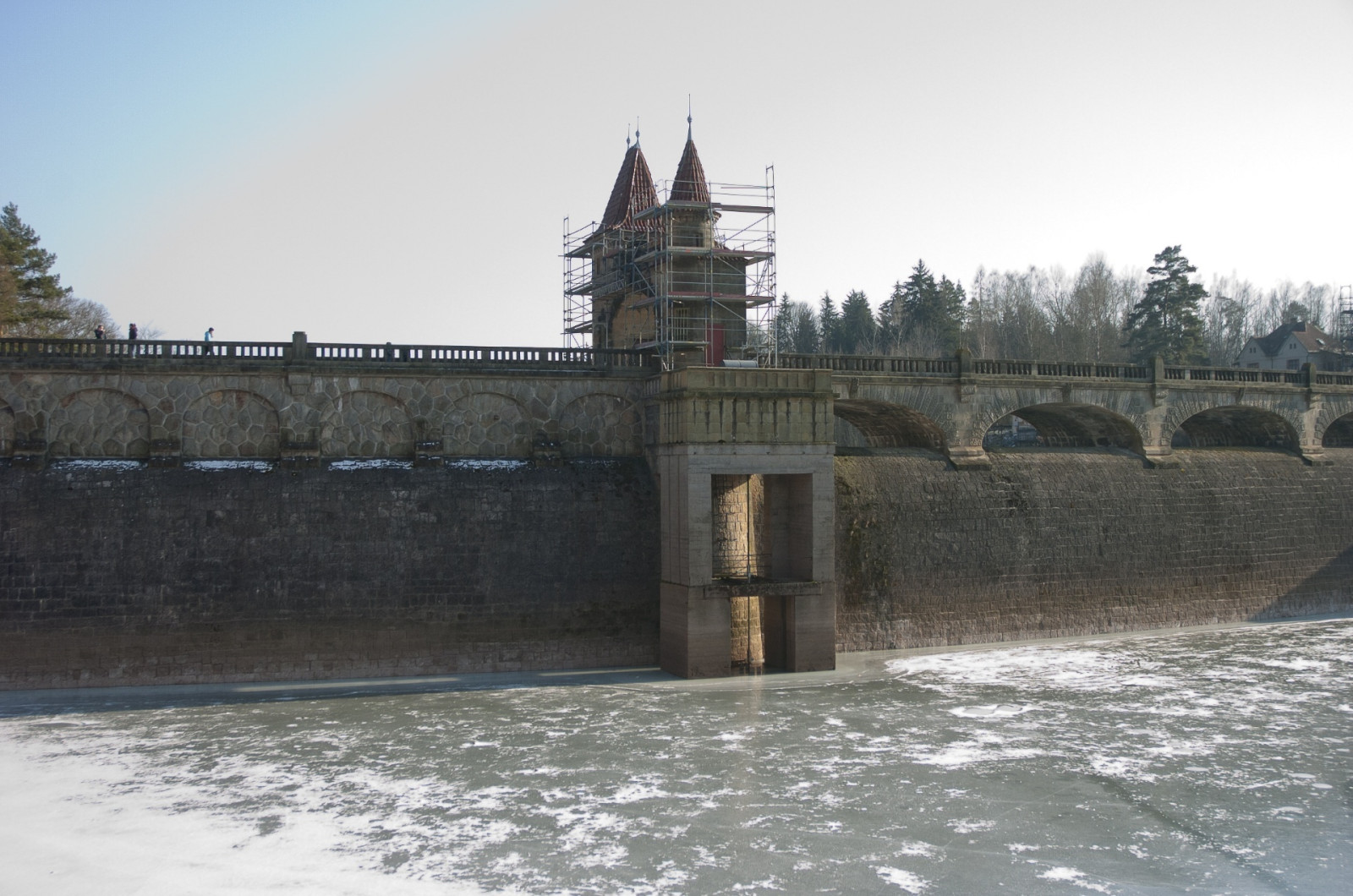 Zamrzlá a navíc rekonstruovaná přehrada Les Království u Dvora Králové nad Labem