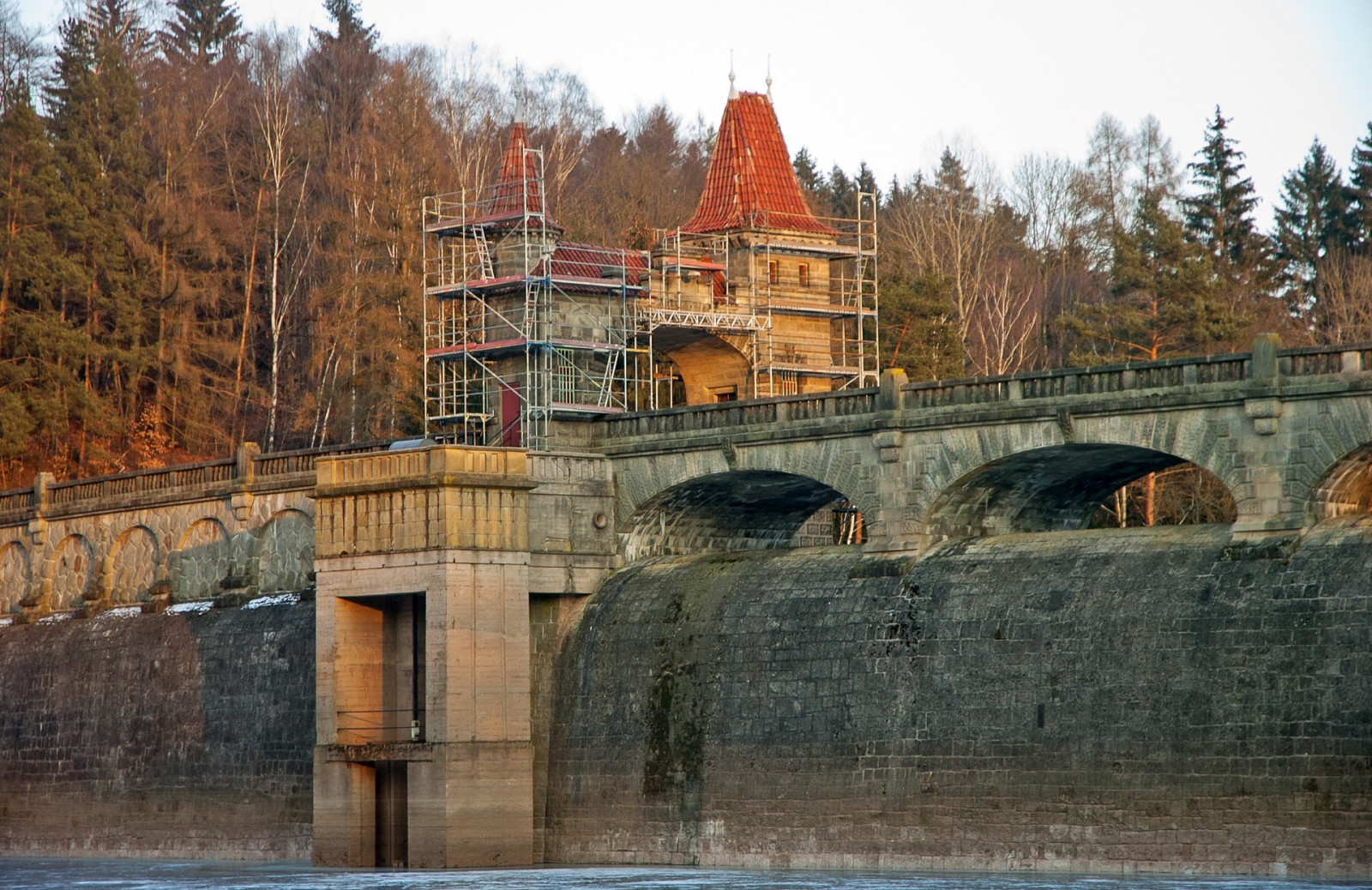 Zamrzlá a navíc rekonstruovaná přehrada Les Království u Dvora Králové nad Labem