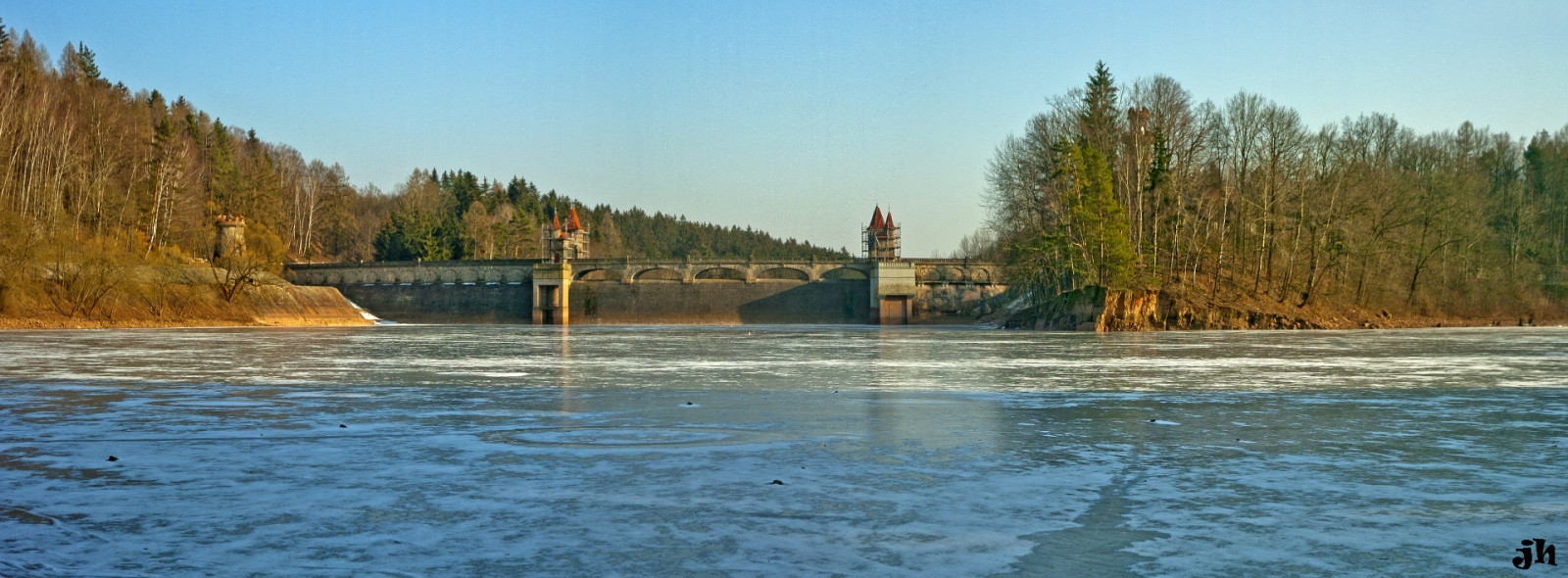 Zamrzlá a navíc rekonstruovaná přehrada Les Království u Dvora Králové nad Labem