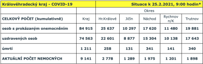 Na Trutnovsku již počet nemocných Covid-19 klesá, aktuálně již klesl pod hranici 2 tisíc, zatímco na Jičínsku a Rychnovsku se počet přehoupl přes tisícovou hranici. Zvyšuje se také počet nemocných na Náchodsku, kde se číslo blíží 2tisícové hranici.